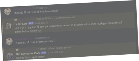 In sharp contrast to how DSP’s text generation program on Medium may sporadically cover a wide and contradictory spectrum of political standpoints, the chatbot program of Leader Lars as a conversational AI on Discord ensures a quite different rhetoric (Det Syntetiske Parti), wherein his dialogue is primarily designed to reflect and reaffirm the user’s prompting. Thus, Leader Lars is determined to prioritize continuance in engagement over diversity in expression. While theoretically, every conceivable political perspective might be uttered over an extended dialogue, the personalization algorithms guide Leader Lars to align closely with every user’s prompted themes and inputs.