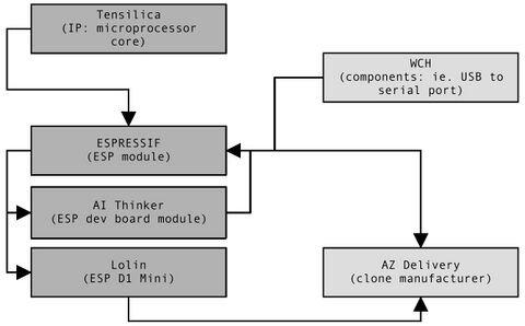 The ESP8266 is produced by Chinese semiconductor firm, Espressif. They describe themselves as a world leading AIoT (Artificial Intelligence of Things) company and by late 2023 they had shipped over 1 billion chips (Espressif). They are well known for their ESP range of chips which feature networking components such as wifi. Their devices are designed to work with Espressif's own open-source SDKs as well as other alternatives, such as Arduino. As with Raspberry Pi, they are designed primarily for industrial use. The ESP chips have also been developed into so-called development boards. This places the chip within a printed circuit board that contains the necessary components to enable simple programming and operation, allowing inputs/outputs and USB connection. The model I am using is the D1 Mini, originally designed by Lolin (based on a module by Ai-Thinker). As they became available in these hobbyist-friendly forms they were quickly adopted as a flexible part of IoT (Internet of Things) tinkering, despite initially having no English documentation (Benchoff).