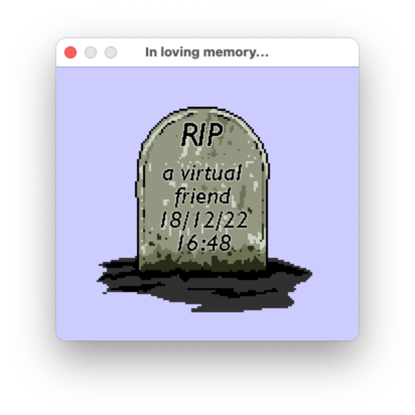 A screengrab of a Mac OS X window containing a pixelated image of a gravestone reading "RIP: a virtual friend".