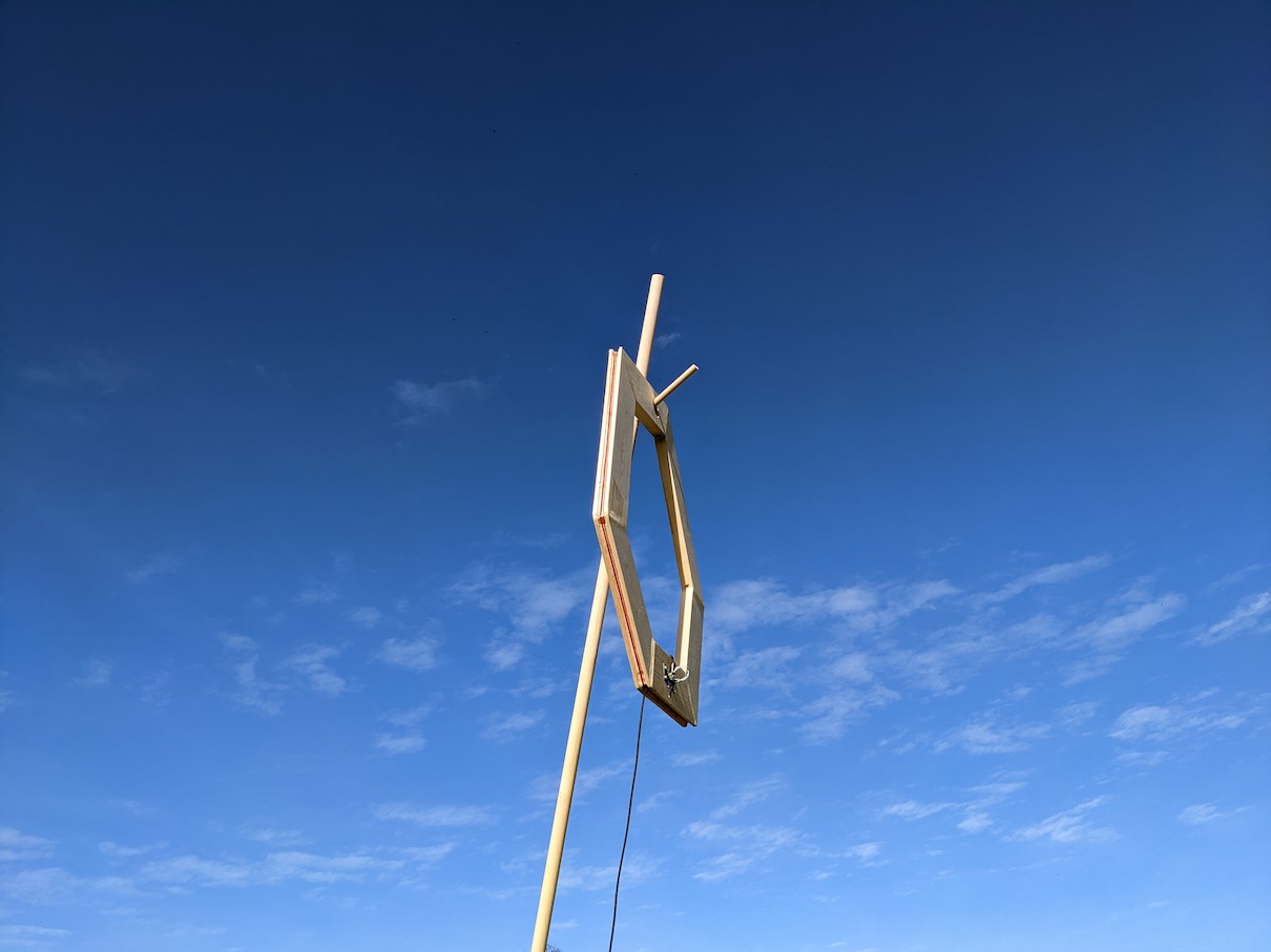 VLF Antenna (Approx 0.8m2, wood, copper wire, audio jack) hanging from a wooden pole against a blue sky.