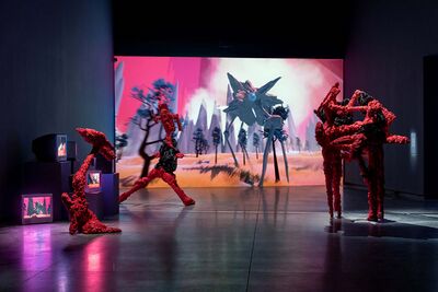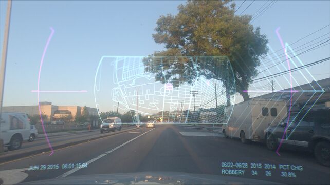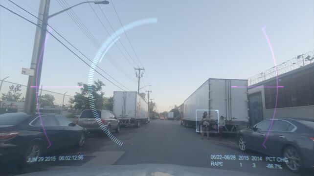 2015, a 21-minute video installation shown at American Artist’s 2019 multimedia solo exhibition My Blue Window at the Queen’s Museum in New York City, assumes the point of view of a dashboard surveillance camera positioned on the hood of a police car cruising through Brooklyn’s side streets and motorways. Superimposed on the vehicle’s front windshield, a continuous flow of statistical data registers the frequency of crime between 2015 and the preceding year: “Murder, 2015: 5, 2014: 7. Percent change: -28.6%”. Below a shifting animation of neon pink clouds, the word “forecasting” appears as the sun rises on the freeway. The vehicle suddenly changes course, veering towards an exit guided by a series of blinking ‘hot spots’ identified on the screen’s navigation grid. Over the deafening din of a police siren, the car races towards its analytically derived patrol zone. The movement of the camera slows to a stop on an abandoned street as the words “Crime Deterred” repetitively pulse across the screen. This narrative arc circuitously structures the filmic point of view of a predictive policing device.