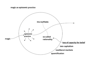 Figure 1 is a diagram drawn by us that represents the role of magic as an epistemic practice in relation to the embodied interaction of individuals (primarily Western subjects) through the world of late techno-capitalism. They can engage with magic (or (techno)magical rituals) as a relational and embodied epistemic practice; yet what they also face, within the Western epistemics, is an overall loss of capacity for belief, fueled by neoliberal markets and datafication. In this epistemic journey, they have to negotiate the pressure of so-called rationality and the inevitable presence of the ineffable, which can be also very normatively interpreted and captured in the form of popular entertainment, traditional belief systems and even random, sub-individual algorithmicised affects of image flows and audiovisual platforms such as TikTok.