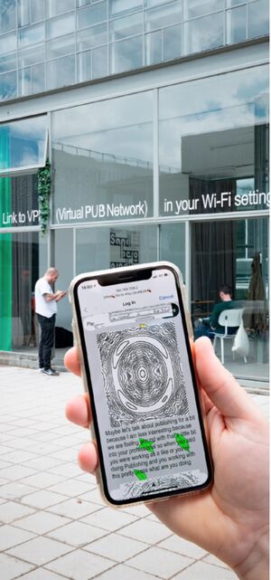 The scene unfolding describes the features of the emancipatory file server, VPN (Virtual PUB Network) (fig. 1). If reaching this screen intervention, you have reached the landing page and are physically near one of the nodes connected to the VPN installation. From this spot, all visitors have access to read and contribute to the growing archive of written, visual, and recorded content of the artwork and emancipatory fileserver, VPN.
