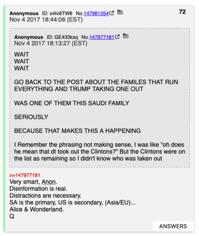 'Research’ in QAnon is typically characterised by the mapping of contemporary events to the content or metadata of Q Drops by QAnon subjects, with Q occasionally intervening to correct or confirm QAnon subjects’ inferences and findings. Beyond the initial series of Drops where Q claimed that the arrest of Hillary Clinton was imminent – “between 7:45 AM - 8:30 AM EST on Monday - the morning on Oct 30, 2017” (1) – they very rarely make explicit claims as to the future. Instead, Q tends to vaguely intone on contemporary events or ‘correct’/‘verify’ the findings of QAnon subjects. Here, the failed prediction that was the basis of the very first Q Drop is illustrative. While Hillary Clinton was not arrested, the 2017-2019 Saudi Arabian purge began some days after the first Q Drop (namely, on the 4th of November 2017) with a wave of arrests across the Gulf State. In response, a user of 4chan’s /pol/ board posited that it was in fact this event that Q was in fact alluding to (fig. 1). Per Q in their reply to said user: “Very smart, Anon. Disinformation is real. Distractions are necessary” (72). In essence, the first Q Drops were framed as about the then-forthcoming purge, with the discussion of Hillary Clinton being misdirection to run cover for this operation.