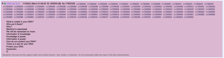 While QAnon is definitionally ‘minor’ in the scale of its technical apparatuses and insofar as it too is characterised by “the deterritorialization of language, the connection of the individual to a political immediacy, and the collective arrangement of utterance” (Deleuze and Guattari 18), the fascist ontology and political project that these tactics and infrastructures produce suggests a certain point of difference that warrants further reflection. That is, where the minor is typically concerned with generating – or making space for – difference within the linguistic/technical apparatuses of a hegemon or oppressor, the space of epistemic difference that QAnon has carved out for itself is only different insofar as it is opposed to the political and epistemic order of the neoliberal regime, while remaining essentially hostile to that which remains Other. In fact – and despite the epistemic heterogeny of the phenomenon – all ‘research’ effectively points to the asserted truth that the phenomenon’s worldview bears the decidedly more concerning implication that the final purpose of the QAnon’s minoritarian tactics and tech is aggressively counter-revolutionary. Namely, it is intent on the erasure of difference from the social formation in favour of a reconfiguration of symbolic authority towards the so-called ‘restoration’ of what is perceived to be the QAnon subject’s ‘rightful’ subject position. The increasingly molecular scale of ‘research’ in QAnon can, therefore, be understood as an effort towards scaling down the world’s heterogeny and difference within the flat onto-ideological field of QAnon’s worldview, which potentially accounts for the deterritorializing vitality of this ‘conspiracy of everything’ (Rothschild). QAnon’s tactics and infrastructures can, therefore, trouble the concept of the minor; and suggest a need to grapple with questions of scale, subjectivation and the technicity of ignorance in addressing the problem of contemporary fascisms.